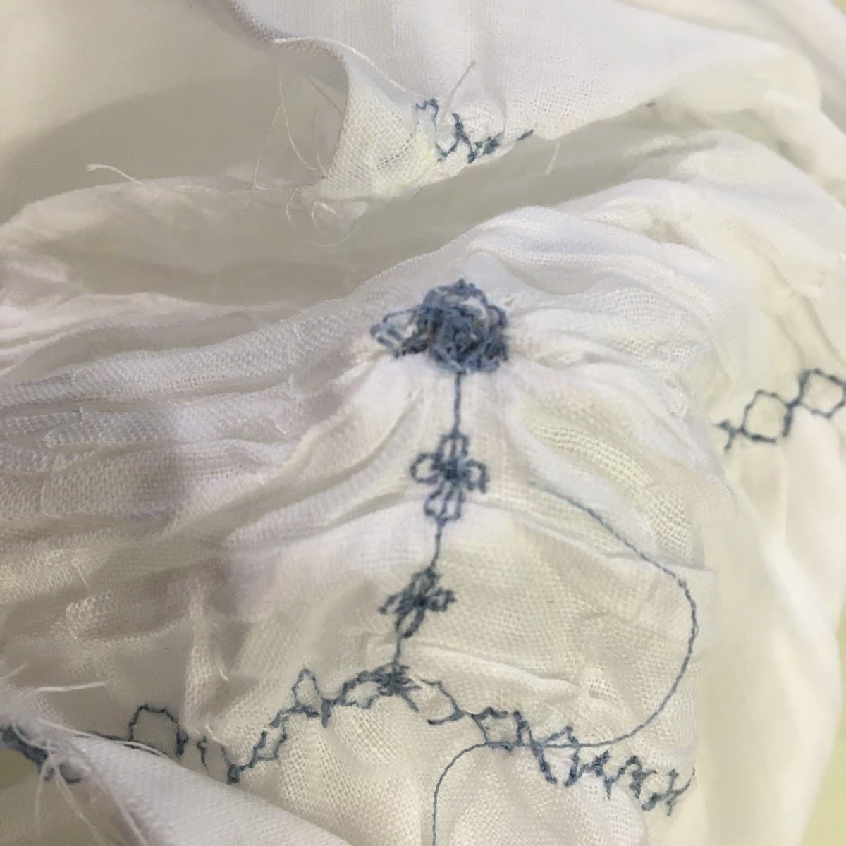 後退がないシンプルな模様に変更。噛んたステッチは、サッカー生地に試し縫いしたときはうまく行ったので、ギャザーを寄せた部分にアイロンテープを貼った状態ではできなかったけど、普通に縫えばかわいい刺繍ステッチになります。