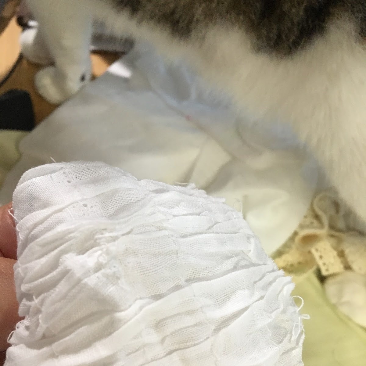 本縫いミシンで大きい縫い目で縫った糸をひっぱってギャザーを寄せてあります。