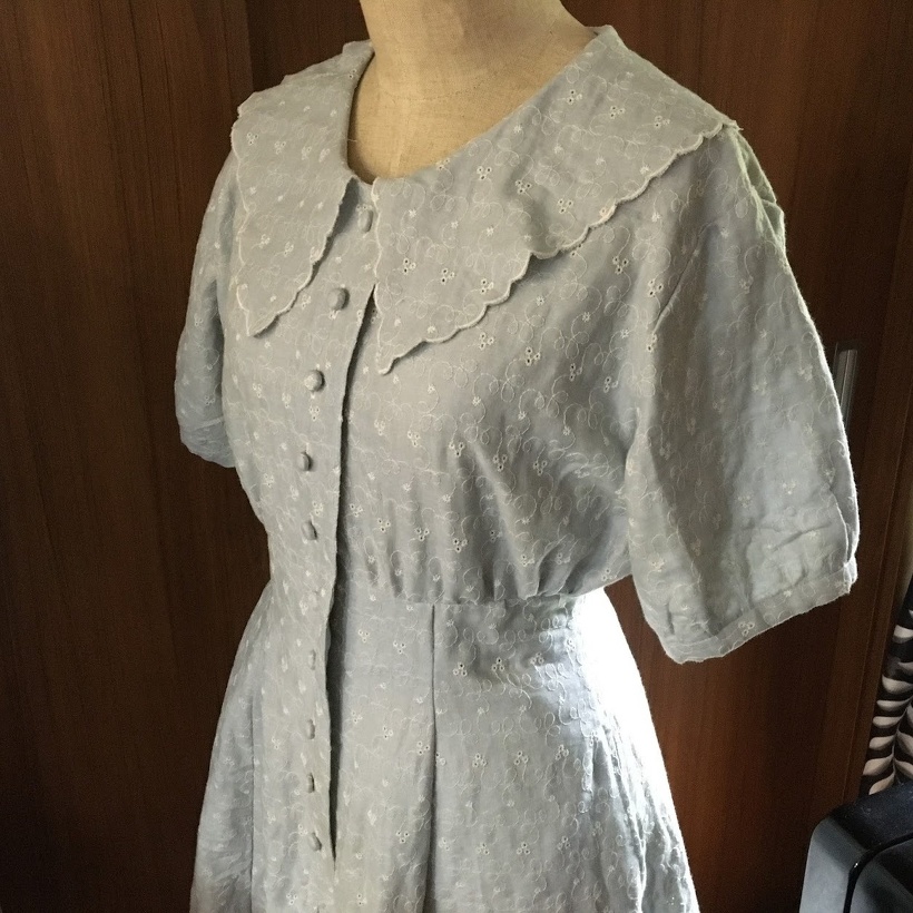 布は、ユザワヤでセールになってた夏生地。抗ウイルス クレンぜ加工のダブルガーゼ刺繍で1m1000円以下で買えたので、1着分3000円程度だったのです。