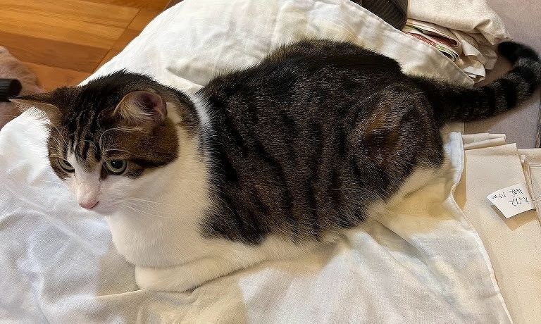 猫 ミシンがない間、サービスして紐遊びをしすぎた。ミシンが戻ってきても紐が振られるのを待っていて申し訳ない気持ち。。。商品になる生地に直接乗らないように、生地を出したらカバーを置くようにしてるけど、昨日はすぐに乗ってきて裁断もできなかったわ。。先月あまり遊んであげてないので、今月はなるべく紐を降ってあげようと思う。w